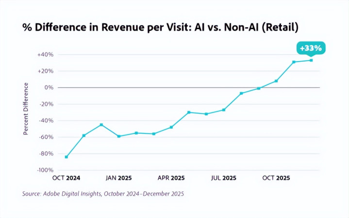 人工智能(AI)流量与非 AI 流量在每次零售访问收入上的百分比差异,从 2024 年末的负值增长到 2025 年末的 33% 的提升。