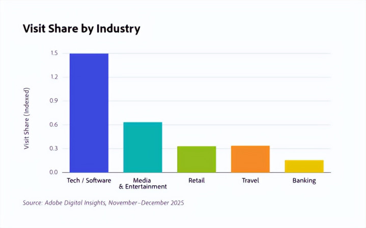 Adobe 最新报告显示,在 2025 年假日季期间,各行业人工智能驱动的流量大幅增长。其中,零售业的增幅最大,流量同比增长 693%。