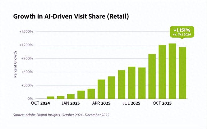 从 2024 年 10 月到 2025 年 10 月,由人工智能驱动的零售访问份额稳步增长,超过 11 倍。