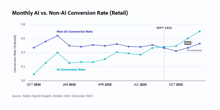 虽然现在还无法确定 2026 年的假日季是否会打破许多新的纪录,但 Adobe 在 2025 年假日购物季(11 月至 12 月)期间观察到的一个主要趋势——由人工智能驱动的对零售网站的推荐——不太可能减少。